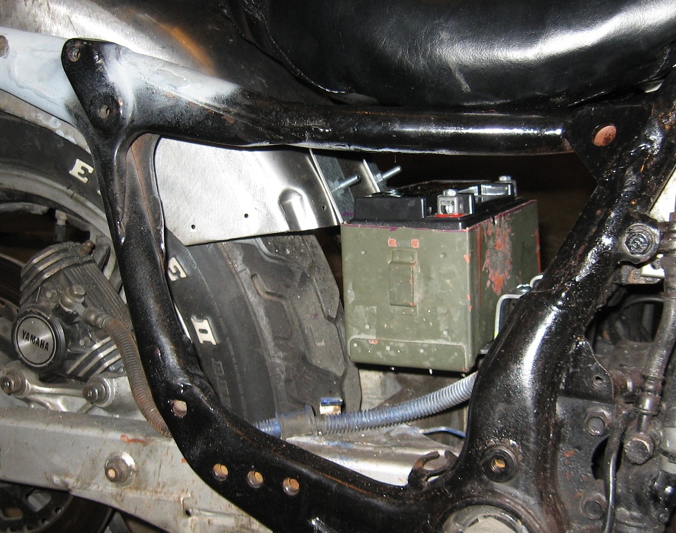 Battery box made out of an old ammo can. I am using an absorbed glass mat sport bike battery- compact and light weight.