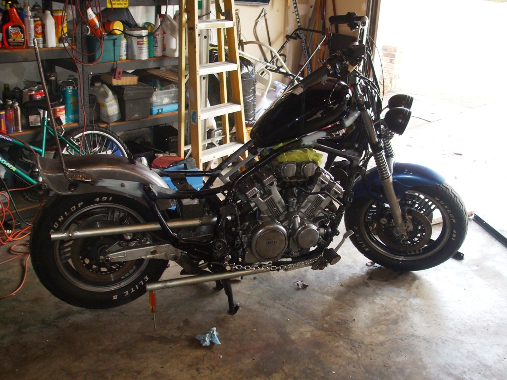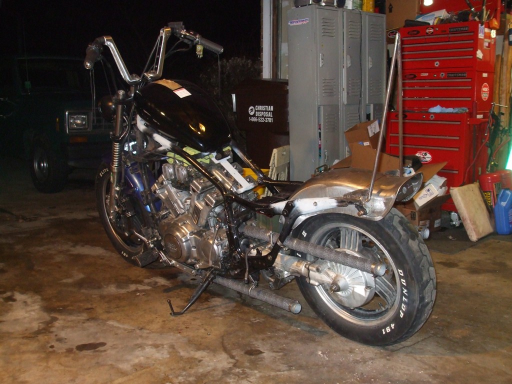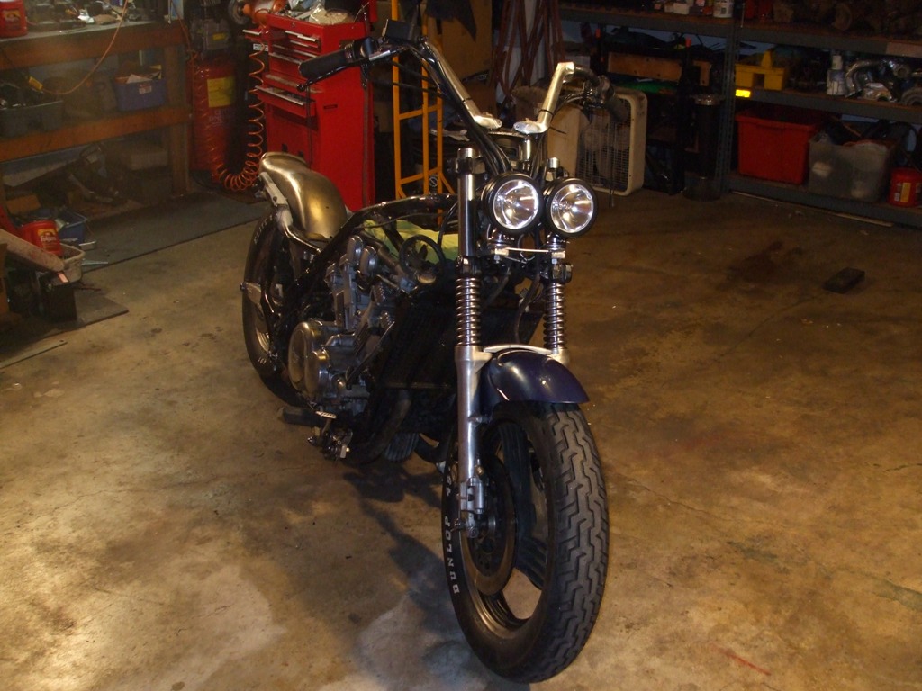 Fired up the engine on Tuesday March 10th for the first time since I began the chopping in late December. WOW! The 4 into 4 pipes sound mean and nasty! I hope to put up a video when the bike is complete.