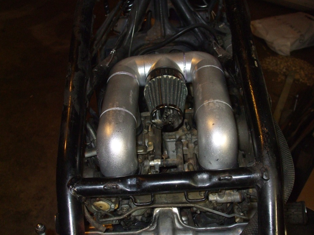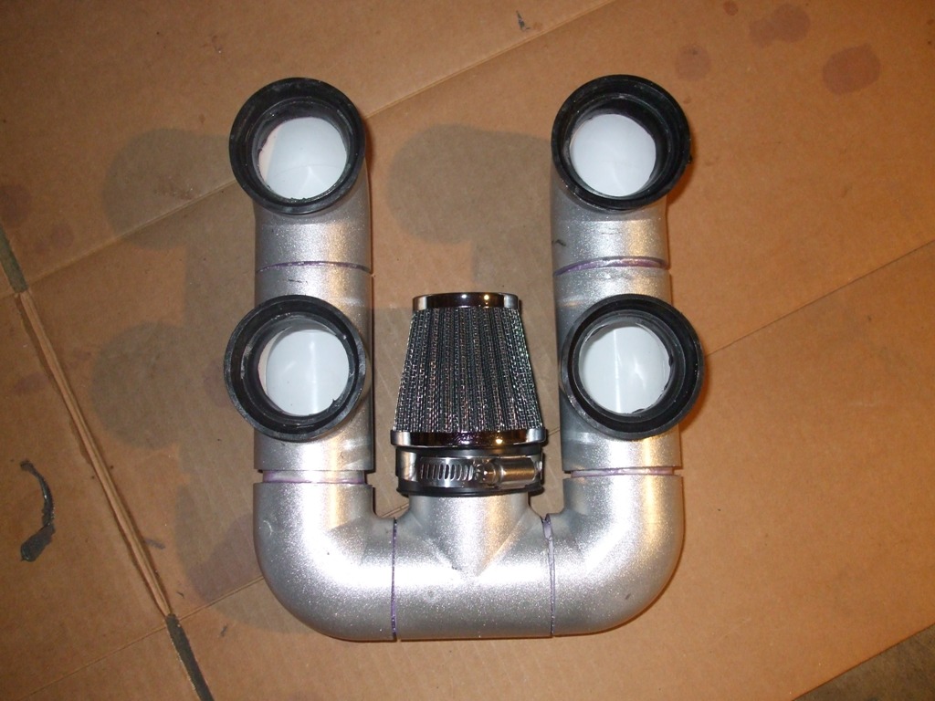 Here is the air intake that I made out of pvc pipe fittings to replace the massive jack in the box deal that was on the carbs before.
