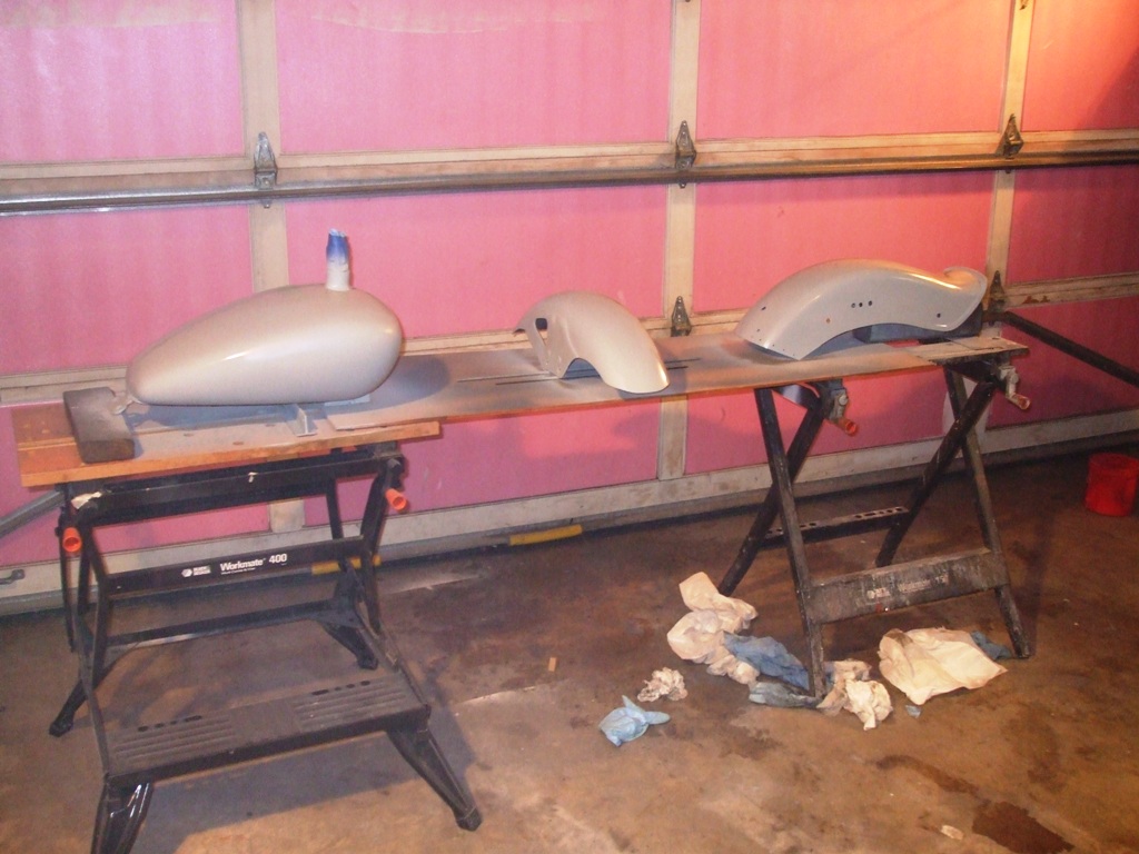 Painting on tank and fenders. The front fender is plastic and I think it obsorbed the prep solvent because the primer bulbled and cracked so we'll have to do it over, but